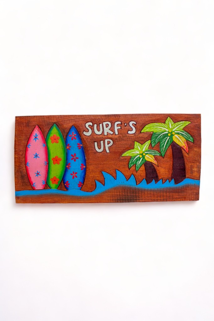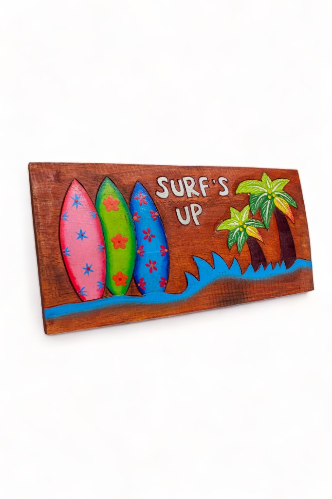 El cartel "SURF'S UP" es un pedazo de surf y mar en madera sostenible, pintado a mano con dedicación. Sus características notables son: